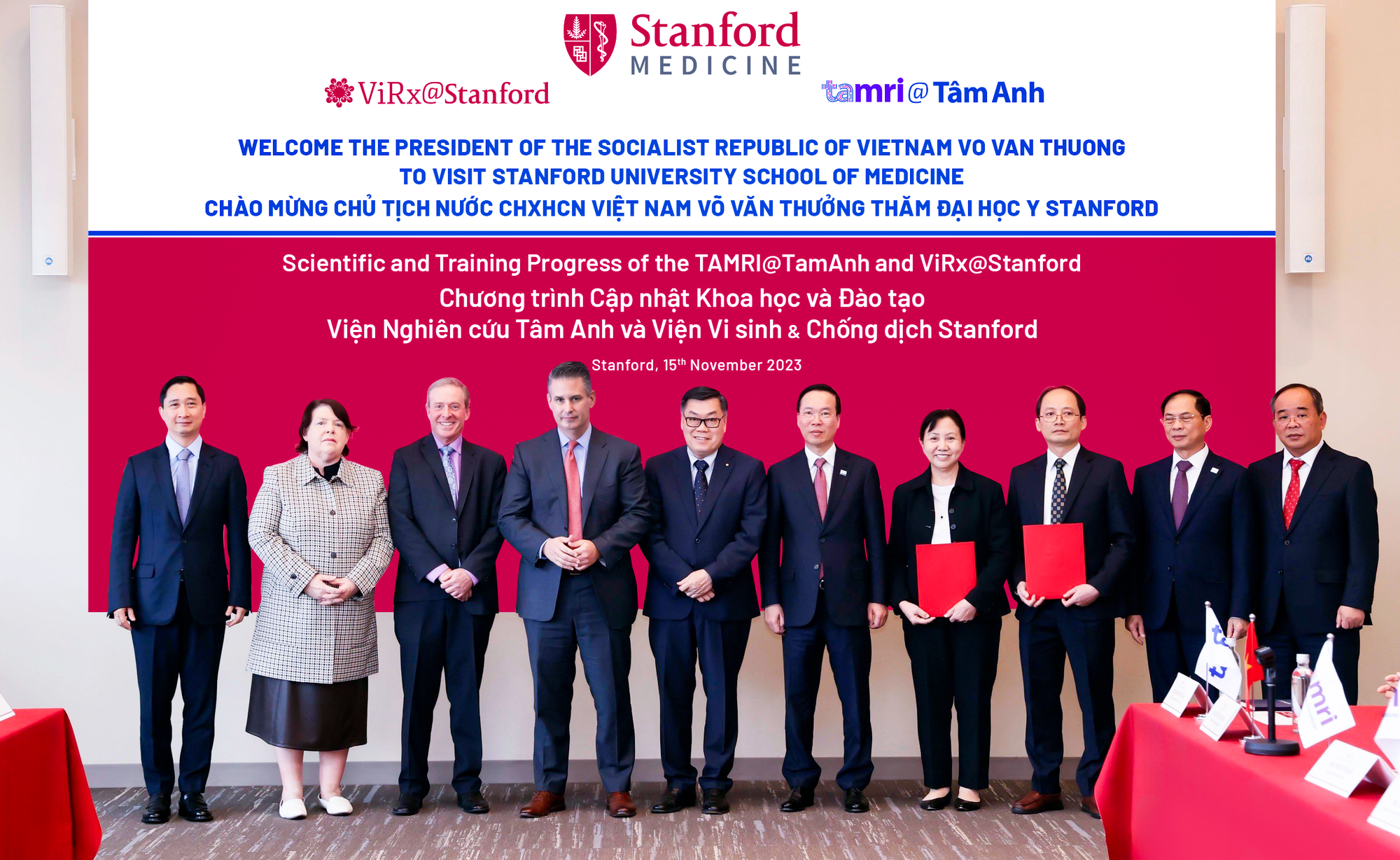 Ngày 15/11, Chủ tịch nước Võ Văn Thưởng đã tới thăm Đại học Stanford và chứng kiến công bố đào tạo xét nghiệm viêm gan D đầu tiên cho Việt Nam, thử nghiệm lâm sàng thuốc mới giữa Viện Vi sinh và Chống dịch Stanford và Viện Nghiên cứu Tamri, Bệnh viện Tâm Anh.