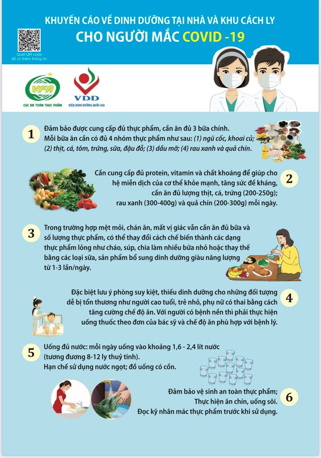 Để bảo đảm dinh dưỡng tại nhà và khu cách ly cho người mắc Covid-19, Bộ Y tế (Cục An toàn thực phẩm) phối hợp với Viện Dinh dưỡng Quốc gia đã xây dựng những hướng dẫn dinh dưỡng cụ thể.