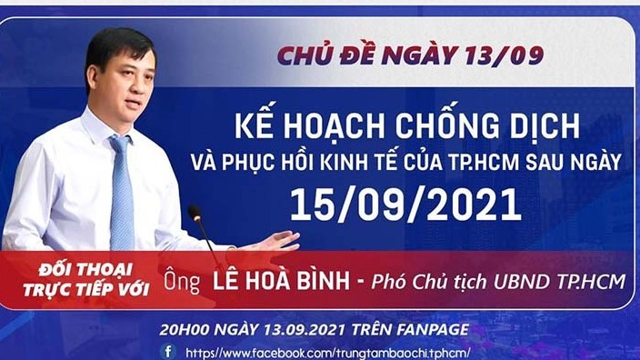 Ngày 13/9, Sở Thông tin và Truyền thông TP Hồ Chí Minh cho biết: Phó Chủ tịch UBND TP Hồ Chí Minh Lê Hòa Bình sẽ tham gia chương trình livestream "Dân hỏi - Thành phố trả lời" vào 20 giờ tối 13/9 để giải đáp thắc mắc về kế hoạch phòng, chống dịch và phục hồi kinh tế của TP Hồ Chí Minh sau ngày 15/9.