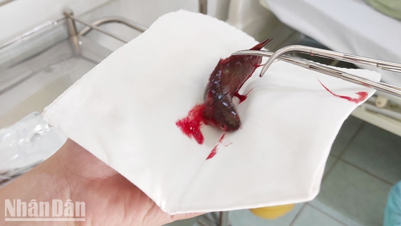 Bác sĩ Nguyễn Hoàng Quý và kíp trực đã gắp được con cá rô ra khỏi họng và nội soi theo dõi vết thương cho bệnh nhân. “Do con cá đã làm tổn thương nhiều ở phần họng và lưỡi gây chảy nhiều máu, bệnh nhân đau đớn không nuốt được nên chúng tôi đã truyền dịch, chích thuốc giảm đau, cầm máu, để bệnh nhân phục hồi dần, sau đó mới có thể ăn nuốt thức ăn mềm”, bác sĩ Quý nói.