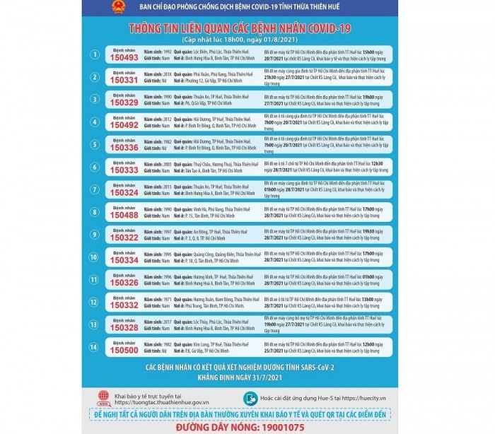 Tất cả 14 trên khi từ TP.HCM đến địa phận tỉnh Thừa Thiên Huế tại chốt kiểm soát y tế Lăng Cô (huyện Phú Lộc) khai báo y tế và thực hiện cách ly tập trung. Cả 14 BN đều có kết quả xét nghiệm dương tính SARS-CoV-2 khẳng định ngày 31/7.