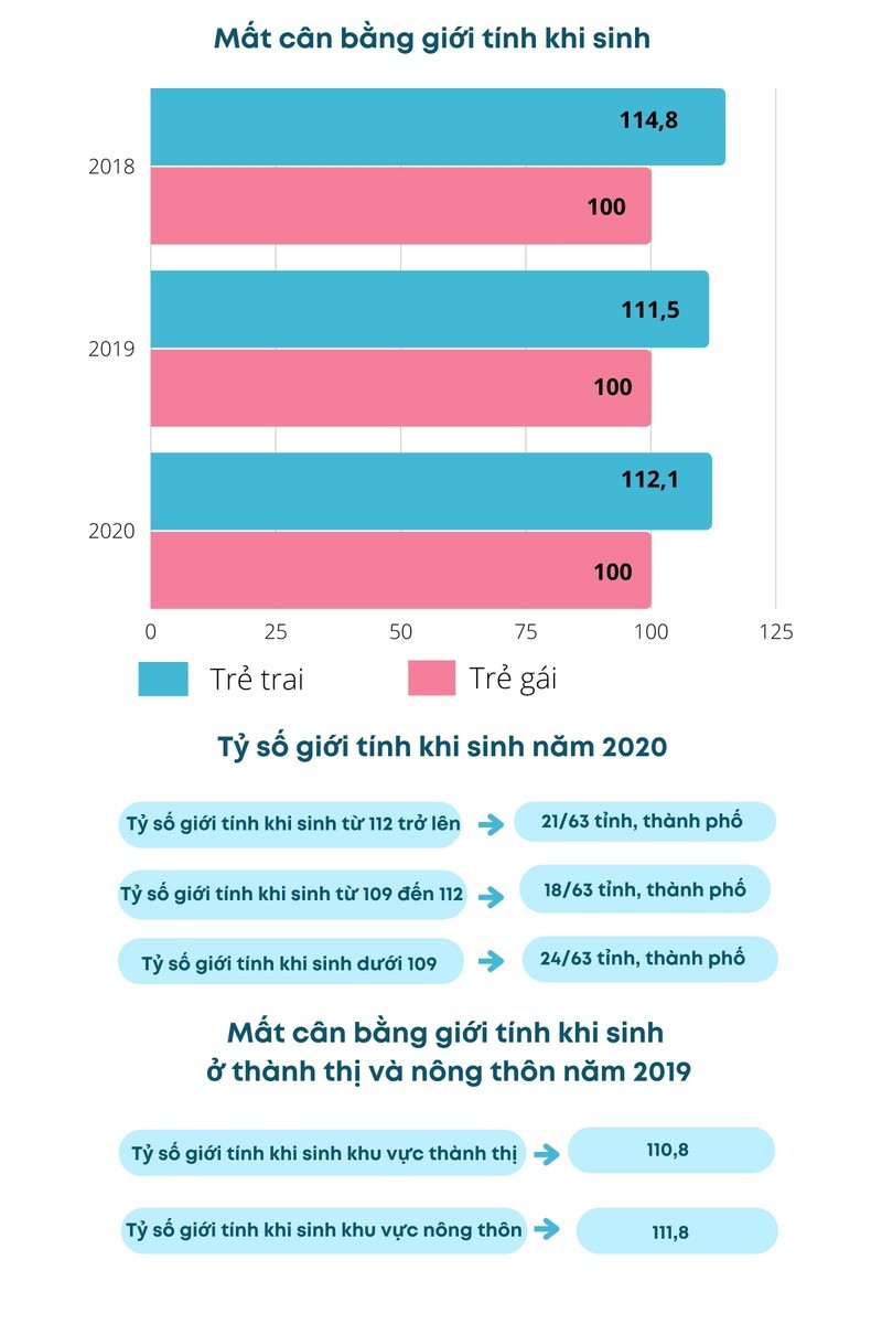 Theo số liệu của Tổng cục Thống kê, năm 2018, tỷ số giới tính khi sinh là 114,8 trẻ trai/100 trẻ gái sinh ra sống, năm 2019 giảm còn 111,5; đến năm 2020 tăng lên mức 112,1.