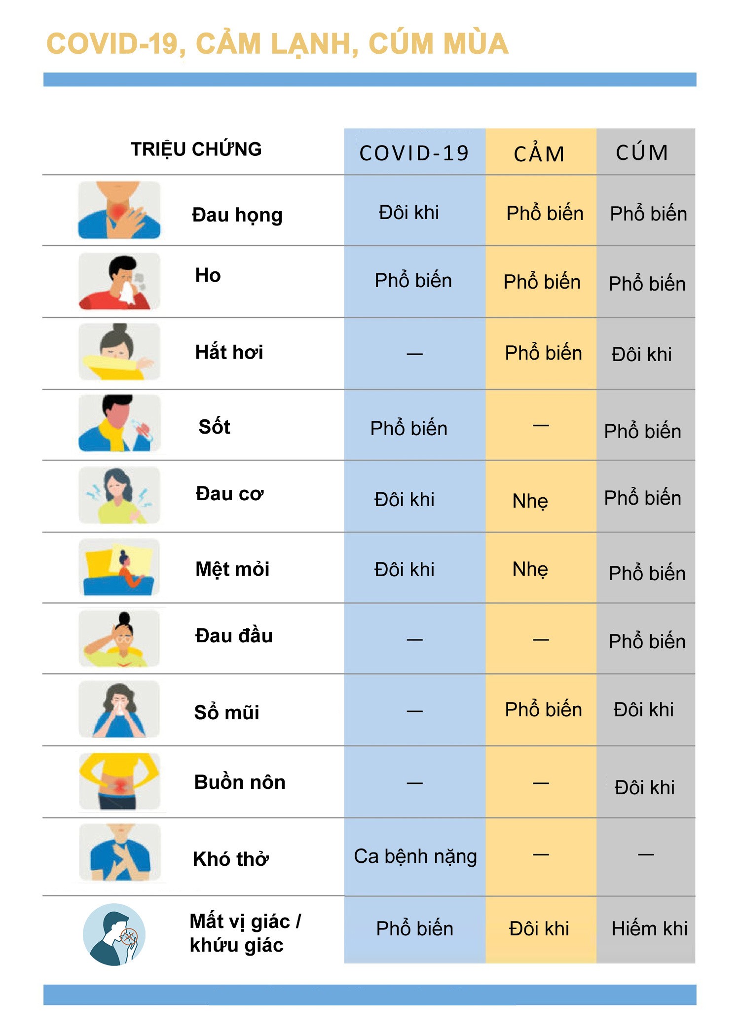 Nhiều bệnh nhân Covid-19 không có biểu hiện bệnh ra bên ngoài. Với các trường hợp có triệu chứng, bạn có thể phân biệt dựa vào thông tin dưới đây. Tuy nhiên, nếu nằm trong đối tượng nguy cơ (đi về từ vùng dịch, tiếp xúc với người bị bệnh...), bạn vẫn nên khai báo y tế để xét nghiệm nếu cần.