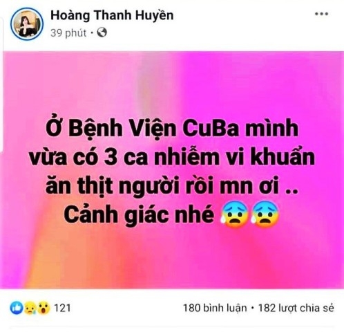 Trước đó, chiều 16-9, một số trang mạng xã hội như facebook Hoàng Thanh Huyền, facebook Quảng Bình TV... đăng tải nội dung "ở Bệnh viện Cuba mình vừa có ba ca nhiễm vi khuẩn ăn thịt người (whitmore) rồi mọi người ơi". Thông tin vừa đưa ra đã có nhiều lượt bình luận và chia sẻ, khiến nhiều người lo lắng.